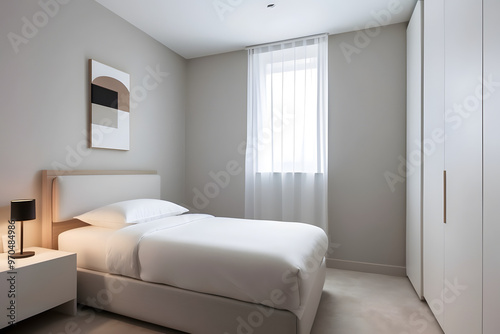 Fototapeta premium A minimalist modernized white decorated single bedroom design