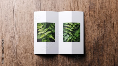 © saichon, Fototapeta premium A minimalist open booklet showcasing vibrant green ferns against a rustic wooden surface.