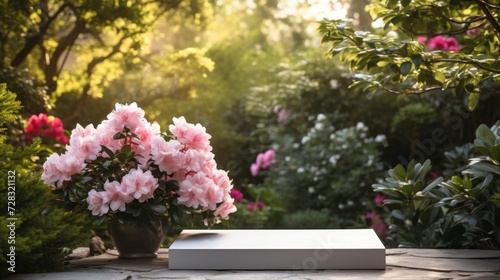 Fototapeta premium A minimalist podium in a serene garden, framed by vibrant flowers and vibrant foliage.