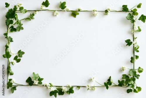 Fototapeta premium A minimalist rectangular frame with a single strand of green ivy and small white blossoms on a white background