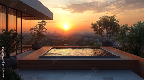 Fototapeta premium A minimalist rooftop terrace with a rectangular hot tub, bordered by sleek wooden panels and minimalist potted plants, with the warm hues of a setting sun reflected on the water’s surface,