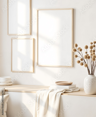 © Anuyj, Fototapeta premium A minimalist scene featuring a sleek white vase filled with delicate dried grass, accompanied by a rustic empty picture frame, all elegantly arranged on a wooden table.