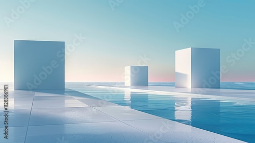 © visoot, Obraz premium A minimalist scene of three cube-shaped buildings on the horizon.