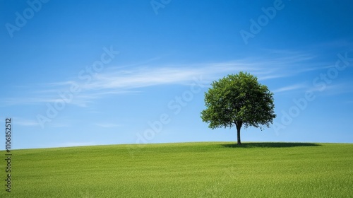 © peerawat, Obraz premium A minimalist shot of a single tree in a vast field under a blue sky