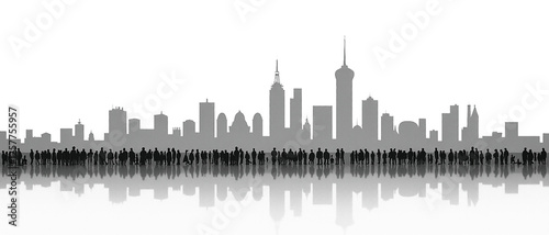 © Sha, Fototapeta premium A minimalist silhouette of a bustling city skyline with a crowd in the foreground, showcasing urban life and architecture.