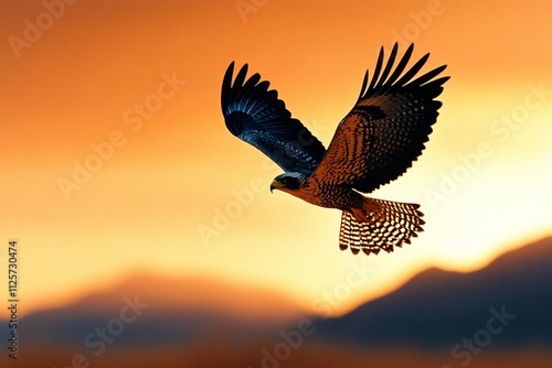 © Thanyarat, Fototapeta premium A minimalist silhouette of an eagle mid-flight, drawn in bold black against a soft gradient sky