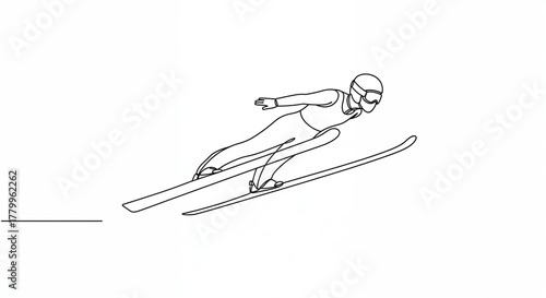 © Sergiy, Fototapeta premium A minimalist single-line illustration depicts a ski jumper gracefully soaring through the air, captured in an elegant, continuous black stroke on a clean white background.