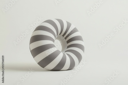 © justjupiter, Obraz premium A minimalist, striped cushion in gray and white, designed in a circular shape, emphasizing modern decor aesthetics.