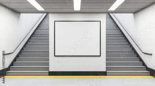 Fototapeta premium A minimalist subway station with two staircases leading up to a blank advertisement wall, offering an open and spacious feel.