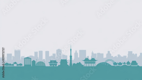 © Stewart Bruce, Naklejka premium A minimalist vector illustration of the Japan Tokyo skyline in a white background. The design uses simple shapes and lines. There Are silhouettes of buildings in grey and turquoise.