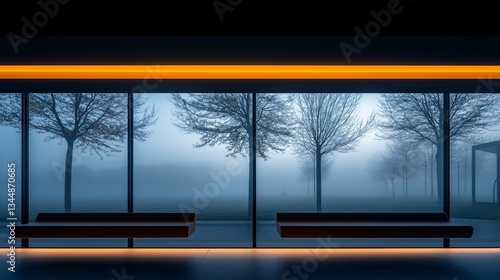 © Zubair, Obraz premium A minimalist view from a modern bus window on a foggy morning, with only silhouettes of trees and soft light illuminating the scene.