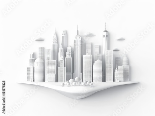 © Preeyanuch, Obraz premium A minimalist white cityscape on a floating island against a white background.