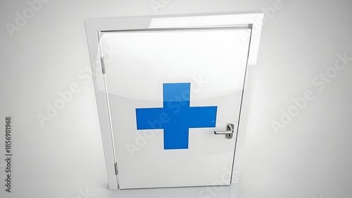 © মোহাম্মদ নাওয়ার, Fototapeta premium A minimalist white door featuring a prominent blue medical cross on a light background.