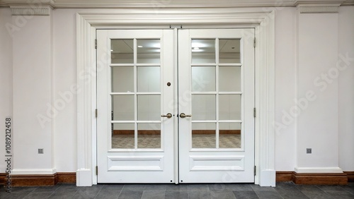 © Chanchai, Fototapeta premium A minimalist white double door with a simple glass design, architectural feature, clean lines, urban feel, minimalist decor