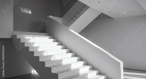 Fototapeta premium A minimalist white staircase in a modern building, with bright sunlight creating a stark contrast of light and shadow on the steps