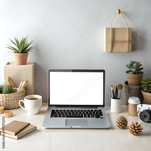 © Ehtisham, Obraz premium A minimalist workspace mockup featuring a laptop with a blank screen. a cup of coffee. and stylish decor.