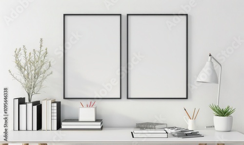 © PERFECTisME, Obraz premium A Minimalist Workspace with a Blank Frame, Books, Desk Lamp, and a Plant