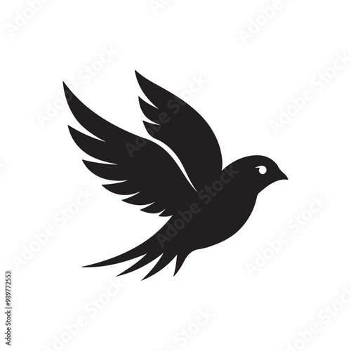 Fototapeta premium A minimalistic black silhouette of a sparrow mid-flight, its wings extended...