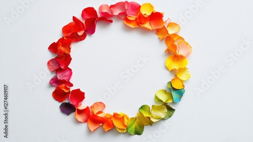 © Y_Malashkevych, Obraz premium A minimalistic circular Rangoli design crafted from vibrant flower petals sits on a plain white background offering a beautiful canvas with ample copy space for creative text placement