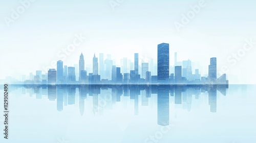 Fototapeta premium A minimalistic illustration of a futuristic smart city skyline reflected on a calm surface, featuring tall buildings in blue tones