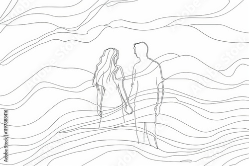 Obraz premium A minimalistic line drawing of a couple holding hands amidst flowing waves.