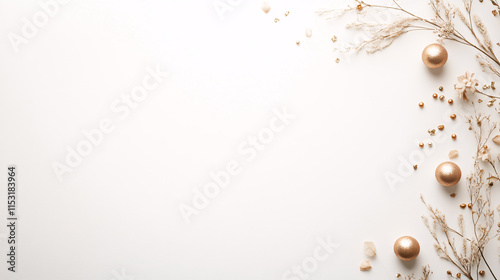 © Thamrong, Fototapeta premium A minimalistic top-view New Year banner design with a clean white background. Golden confetti scattered delicately along the edges and a few small, metallic balloon ornaments create a subtle festive