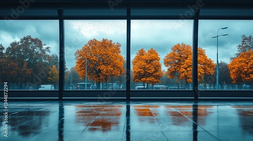 © Zubair, Obraz premium A minimalistic view from a bus window on a rainy day, with soft reflections of trees and cloudy skies creating a soothing atmosphere.