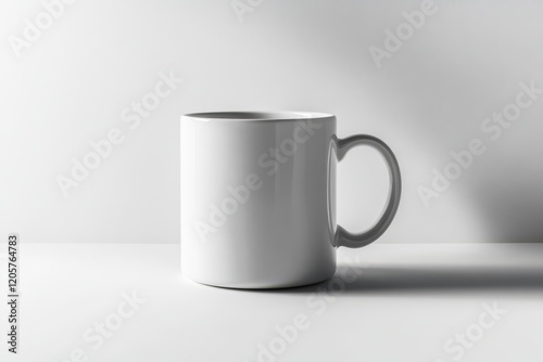 Fototapeta premium A minimalistic white mug is positioned on a light surface, casting a subtle shadow, emphasizing its smooth curves and clean design.