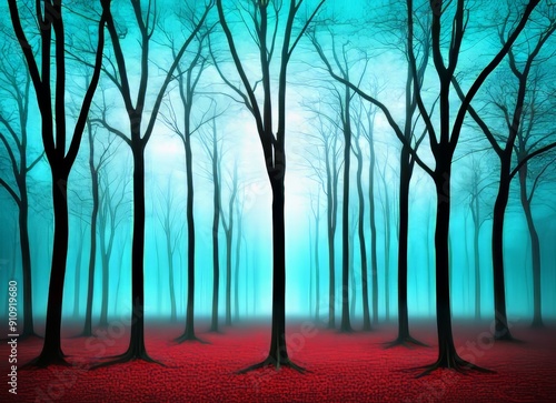 © Emqan, Obraz premium A misty autumn forest with tall trees and fallen leaves on the ground.