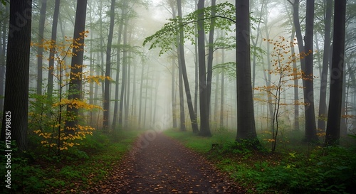 © Madep, Fototapeta premium A misty autumnal forest path winds through tall trees, bathed in muted light.