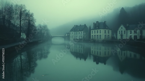 Fototapeta premium A misty canal scene with reflections of old buildings and trees in a serene...