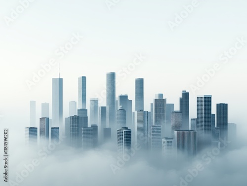 Fototapeta premium A misty city skyline with modern skyscrapers emerging through low clouds,...