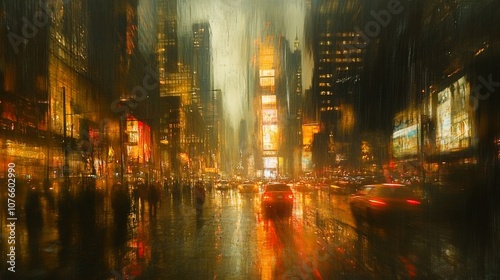 Obraz premium A misty cityscape at night with traffic and pedestrians, illuminated by...