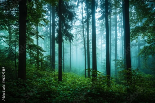 Naklejka premium A misty, enchanting forest with towering trees and vibrant green foliage, evokes a sense of tranquility and wonder, offering a peaceful retreat into nature's depths.