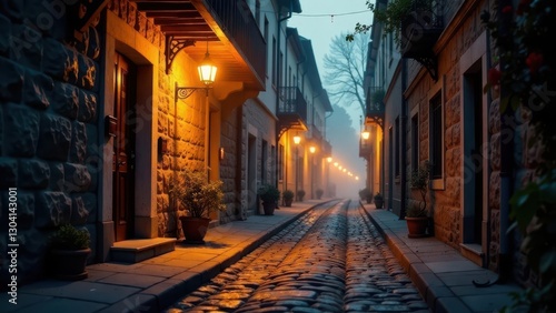 © Angel Pic, Fototapeta premium A misty evening scene on a quaint cobblestone street, lined with charming stone buildings, illuminated by warm gaslights, creates a serene and peaceful atmosphere.