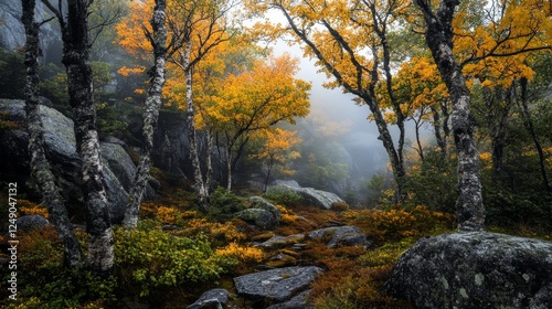© Halina Berah, Obraz premium A misty fog descends upon a peaceful forest, where only a dim light from above manages to make its way through the branches