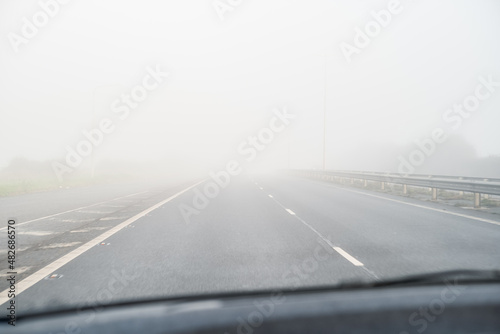 Fototapeta premium A misty, foggy road and dashed white centre line as seen through a car windscreen. There is slight motion blur.