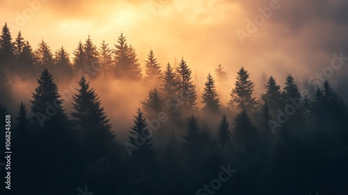 Naklejka premium A misty forest at dawn with silhouettes of evergreen tree against a golden sky.