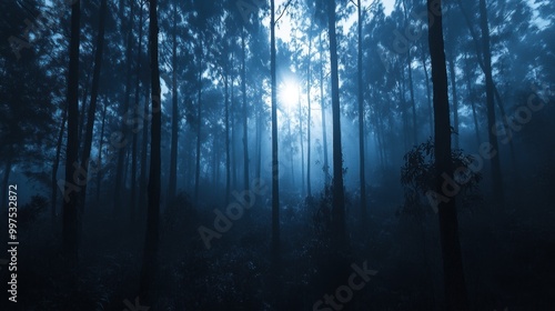 Obraz premium A Misty Forest at Dusk with Sunlight Filtering Through the Trees
