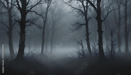 © Monster, Obraz premium A misty forest filled with bare trees in a dark and mysterious woodland setting.