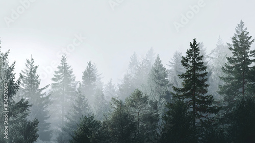 Fototapeta premium A misty forest filled with evergreen trees. The atmosphere is quiet and...