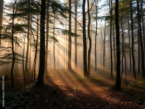 Obraz premium A misty forest floor shrouded in soft morning light, forest scenery, misty...