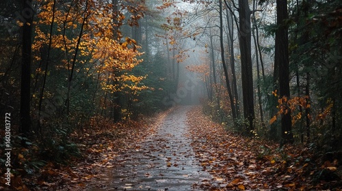 Fototapeta premium A misty forest path covered with fallen autumn leaves, surrounded by tall...