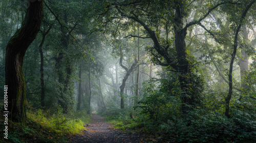 Fototapeta premium A misty forest path leads through a vibrant green woodland.