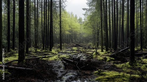 Obraz premium A misty forest path leads through tall trees, with fallen branches and mossy...