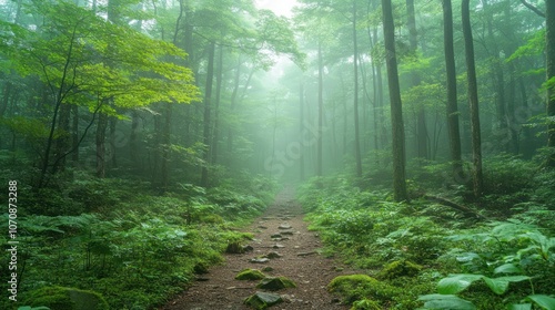 © irawan710, Fototapeta premium A misty forest path lined with trees and ferns.
