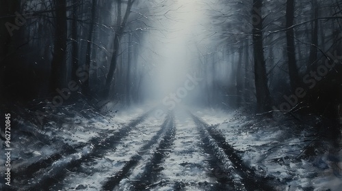 © desi, Obraz premium A misty forest path shrouded in fog, creating an eerie and mysterious atmosphere.