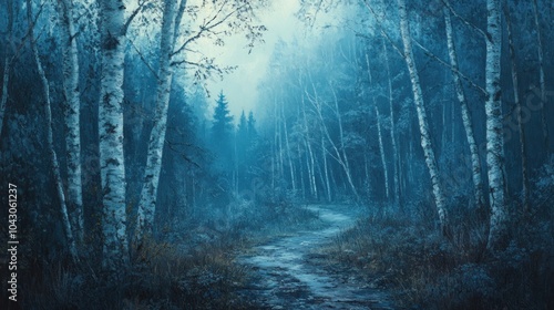 Obraz premium A misty forest path surrounded by birch trees, evoking a serene, mystical...