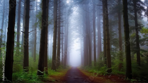 Obraz premium A misty forest path surrounded by tall trees, evoking a sense of tranquility...