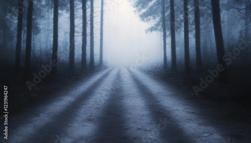 Fototapeta premium A misty forest path surrounded by tall trees, leading into an ethereal light,...